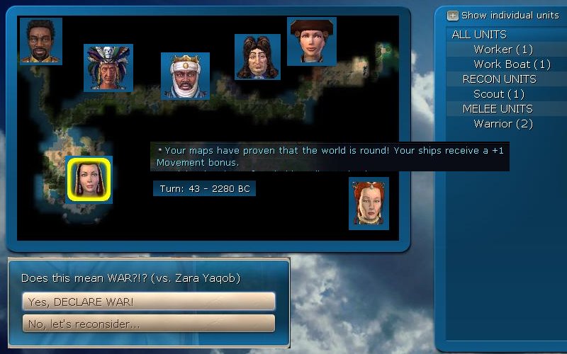 Catherine turns up next (T33 - 2680BC) and then Zara (T36 - 2560BC). I finally met #6, Elizabeth on T37 (2520BC) and that brings my competitors to a close. My scout has blasted straight East for the majority of the game while I have a work boat heading up the West coast towards Zara. His borders block the way, but nothing that a little war declaration cannot fix. Thus on T43 (2280BC), I prove that the world is in fact round ...