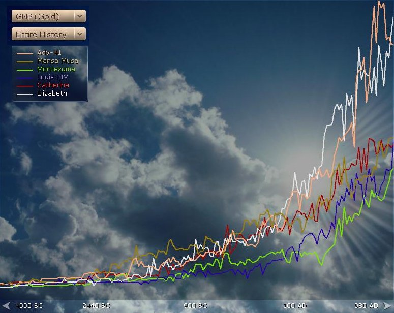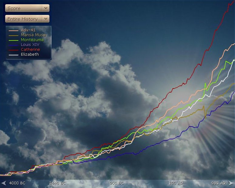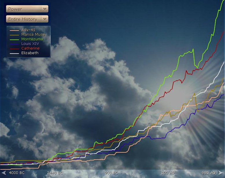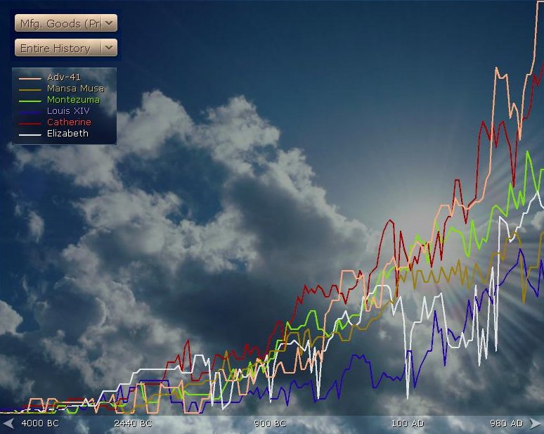 And so 1000AD rocked around. I was second in score to Catherine (1164 to my 888) with 10 cities (all Buddhist). Buddhism was the dominant religion (31%). Elizabeth had Drama, Music, Philo and Compass on me. I had techs on everyone else. I was friendly with Monty (+7) and less with everyone else. Monty was in such a good mood that he was happy to trade me Ivory for Copper. I had the AP almost in the bag and the really big tech for my game was only a few turns away.