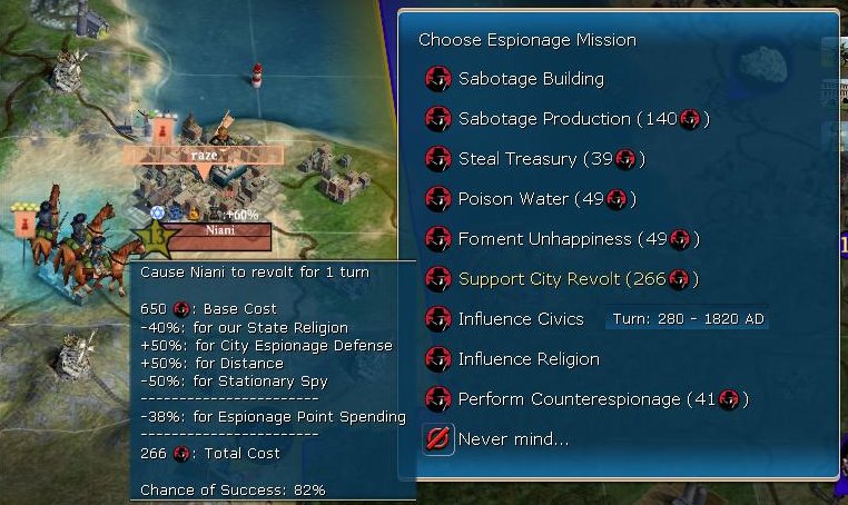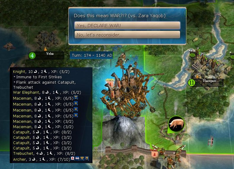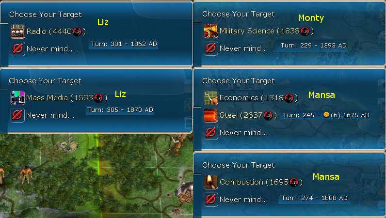 The really big tech? Why Engineering of course, unlocking my Citadels. My production cities had all build walls and would start on citadels as soon as possible. Right around this time, Zara decided to get cute and used his EPs against me. How did I know that he did it ... because I went back to the turn before and compared EPs. The BUG mod is working on putting this information into the Espionage Screen.