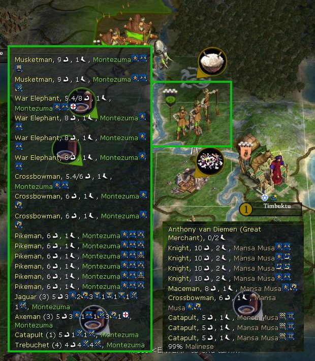 Monty war #2 finished Monty off. I even bribed Mansa back into the deal against Monty. This did two things - distracted Monty and killed some of Mansa's units, allowing me to roll straight from finishing Monty off to taking out Mansa. I burnt some of my Mansa EPs to revolt one of his final cities so that my 2 mover cavalry could roll straight in without the need of siege weapons.
