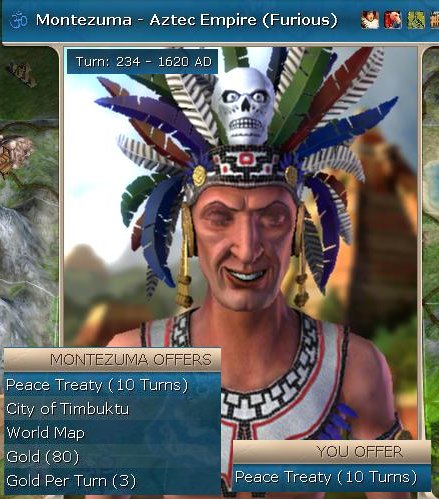 Timbuktu was a very small little city (size 1), totally crushed by Mansa's culture, but it was the Hindu holy city and pulling 68g per turn. A very nice little pickup. During the Monty War # 1, I also knocked off Zara's ex-barbarian city - so he was no more. I had also started to dial up my espionage slider, running at 70%. This allowed me to gain city visibility on all the other leaders. It also allowed me to pick up some critical techs from various leaders ...