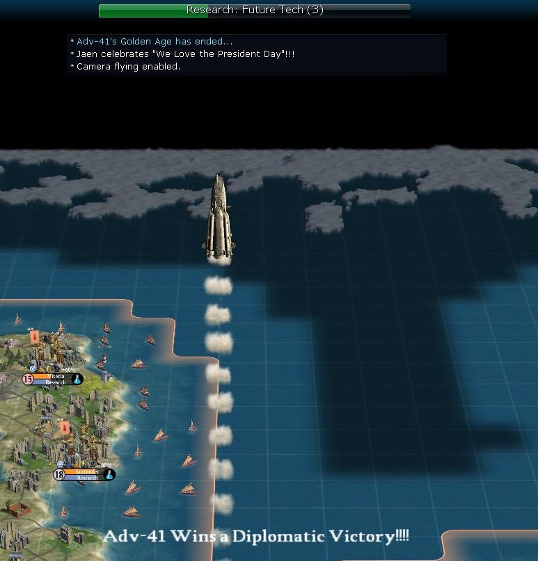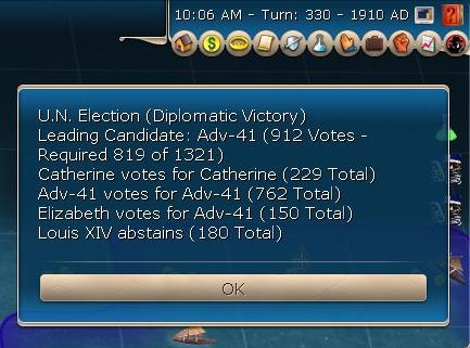 Catherine finished the UN and the diplo victory came up on the turn before I was going to launch. I didn't think anyone would vote for me ... I was wrong.