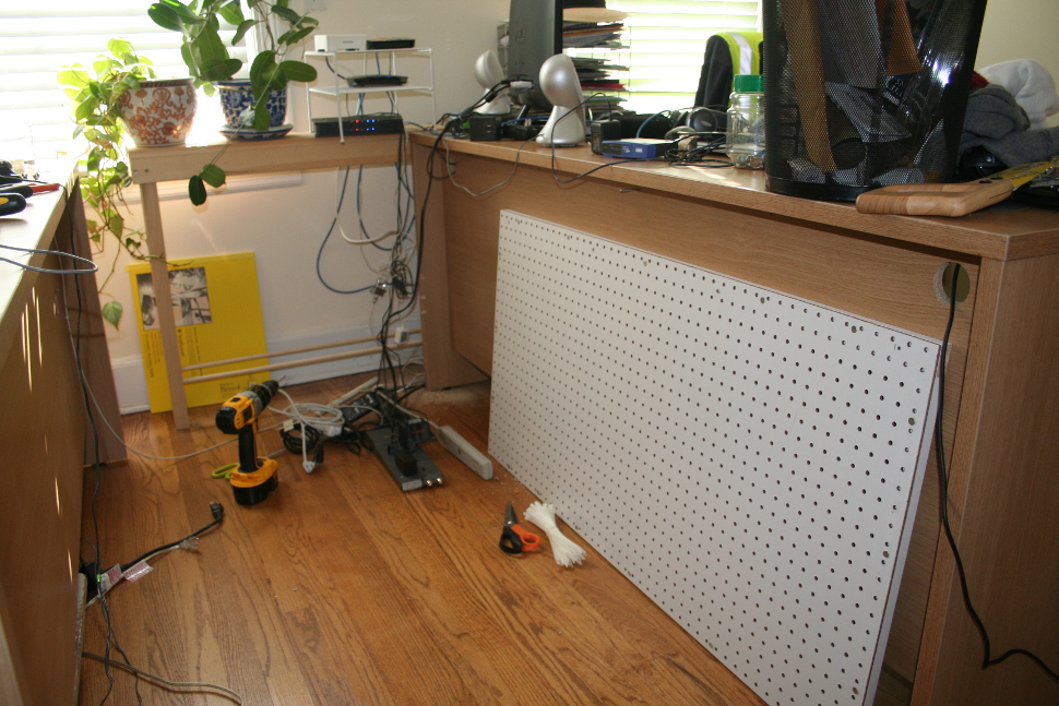 So ... tidy up cabling time! I pulled our desks apart, got some masonite, put up some 1" by 0.5" boards around the edge to provide some support to the masonite, drilled holes in the back of my desk (have to hang the board somewhere) and started to zip tie everything to the board ...
