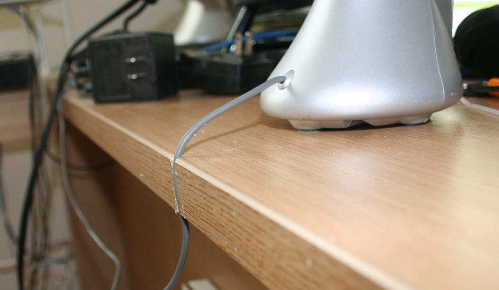 We both have some speakers that sit in the middle of our desks. I didn't really want to run cables from the grommetted (if that is a word) holes ... so I drilled tiny little access points for the cables ... remember - these desks will be pushed together and, when that happens, that wire isn't going anywhere.