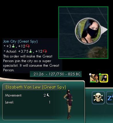 I ran some library fueled scientists in my capital, trying for an Acadamy ... however, luck wasn't with me and Elizabeth Van Lew popped up. Who? She isn't in BtS as a Great Spy! This is more Lemon Lab BAT work at play ... I even get a female Great Spy graphic ...