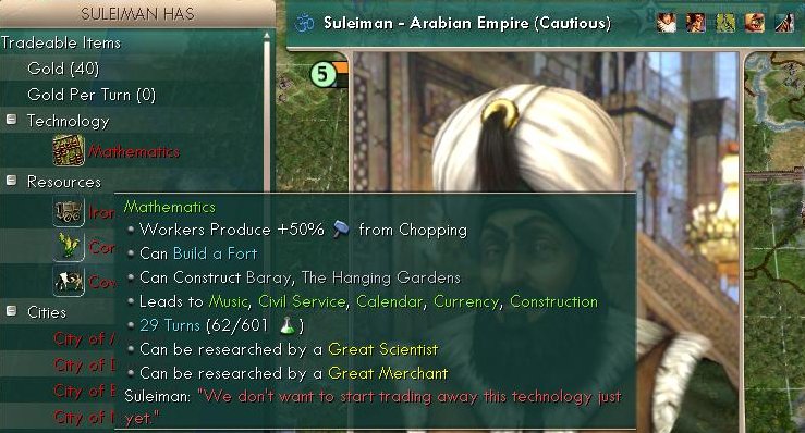 Ok, a couple of other AIs are teching Maths so I should be able to trade for it in a couple (14!) turns. I can wait. I'll tech Literature and knock out The Great Library in the meantime.
