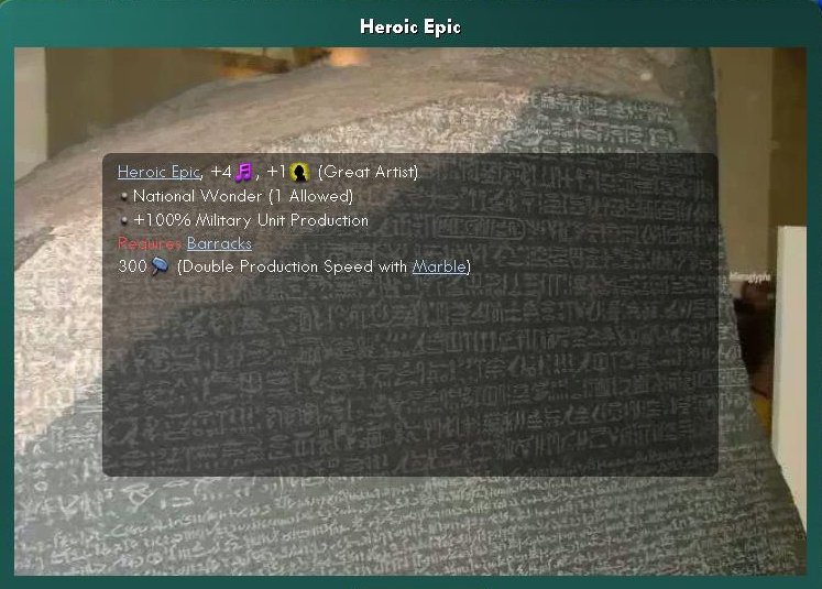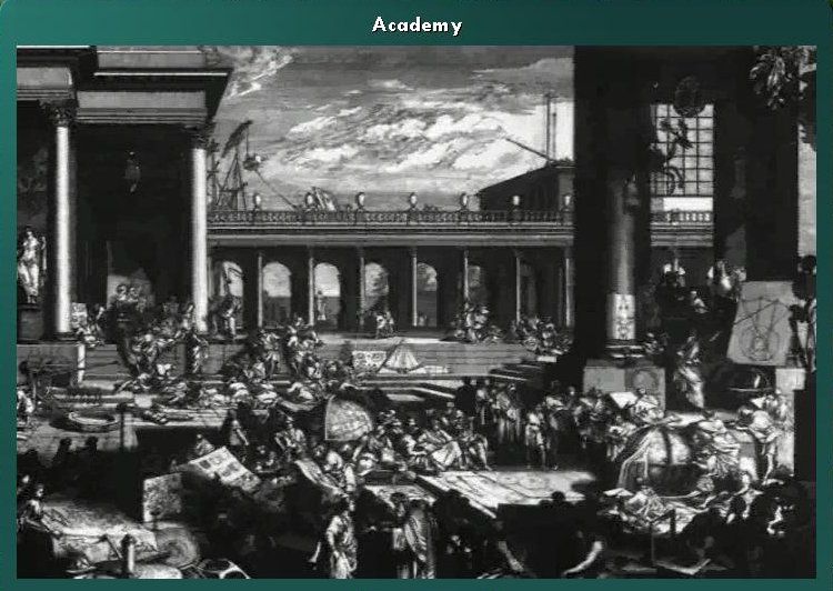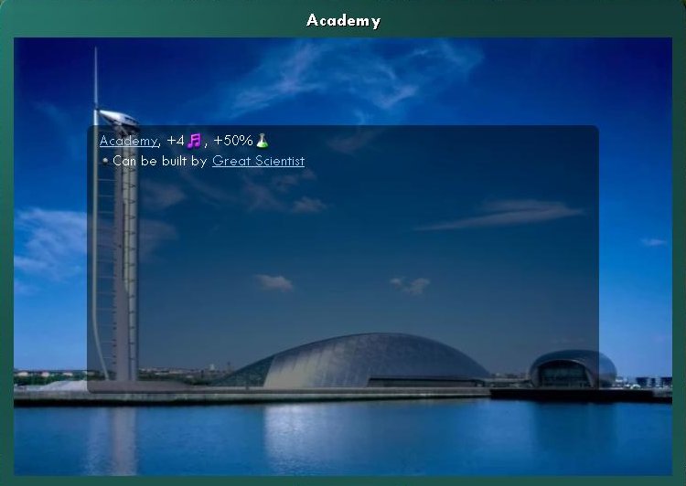 At this point, my next Great Person is due in a few turns (100% Scientist) so I will horde gold, wait until my Academy is in play and tech stupid Mathematics myself. Welcome Hildegard of Bingen ... who? - another of Lemon's Female additions to the game. And so it is my first Academy in my Capital ... which shows off another of BAT's additions ... movies for National Wonders ...
