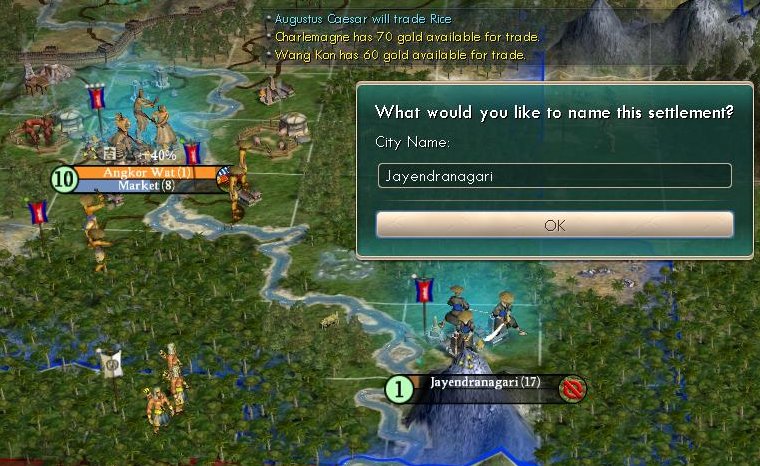 Meanwhile, Charlemagne comes begging for Code of Laws (oh, ok) so I turn around and give him the 'alms for the poor' treatment that nets me 60g. I also flip Meditation to Sitting Bull for gold. A few turns later, Suryavarman II has finishes Maths ... but he won't part for it because he doesn't like me enough. I then do a rush job of trying to improve our relationship ...